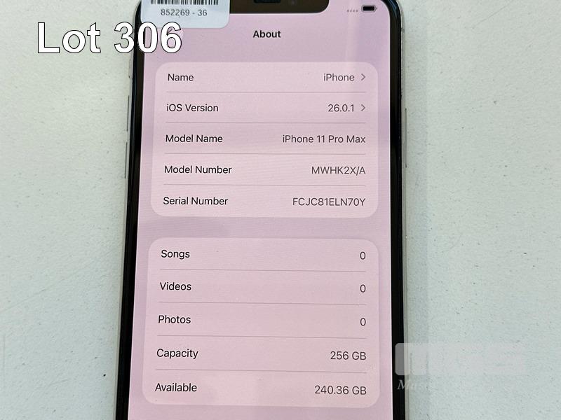 APPLE iPHONE 11 PRO MAX, 256GB, MODEL MWHK2X/A, A2218, SILVER, BATTERY HEALTH 95% (NO CABLE, NO CHARGER) (NOTE: MINOR SCRATCHES ON SCREEN) S/N:FCJC81ELN70Y
