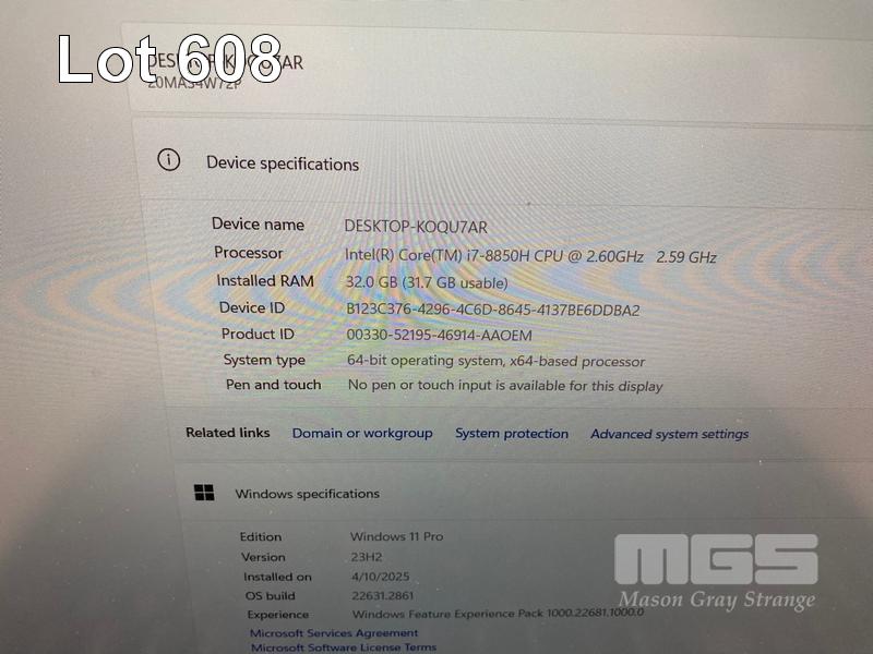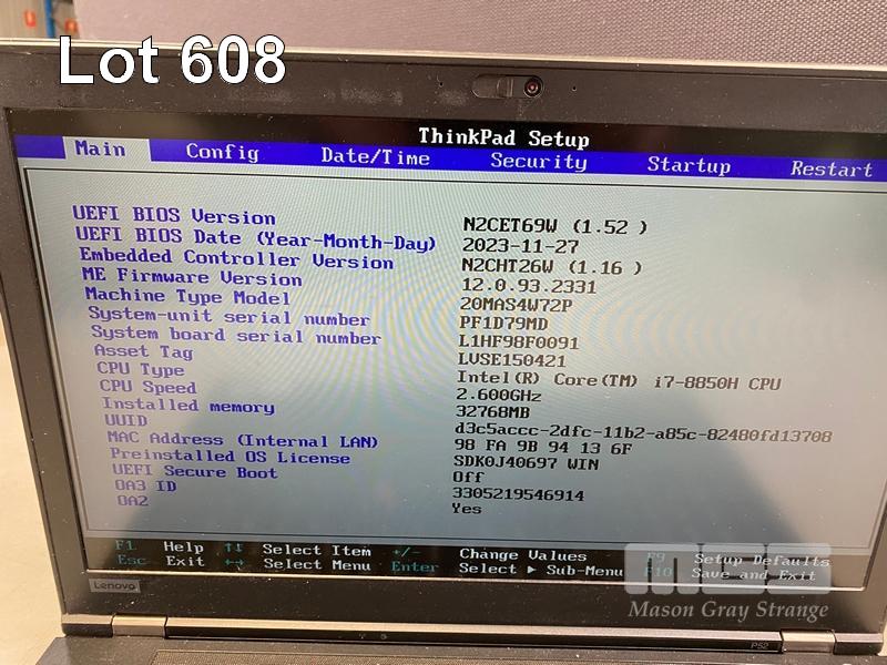 LAPTOP, LENOVO THINKPAD P52 MOBILE WORKSTATION, TYPE 20MA, CORE i7 8850H (8TH GEN) @ 2.6GHz, 32GB DDR4 RAM, 525GB SSD, 15.6" WIDESCREEN (1920x1080), 4GB NVIDIA QUADRO P2000 VIDEO, Wi-Fi, BLUETOOTH, WINDOWS 11 PRO INSTALLED (NO POWER SUPPLY) (NOTE: POOR CONDITION, MARKS ON SCREEN, TOUCHPAD WORN) S/N:PF1D79MD