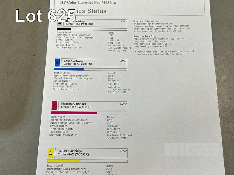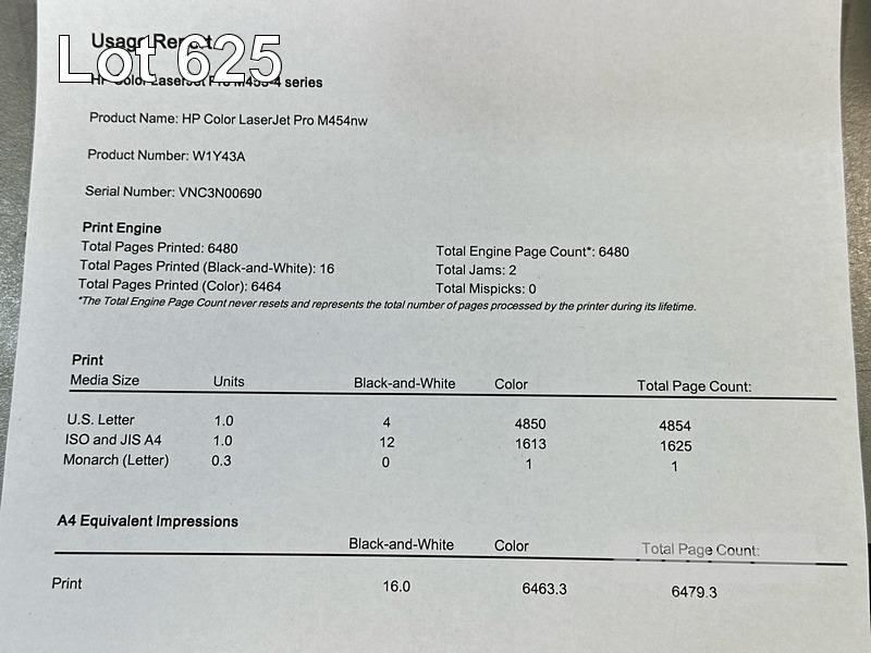 PRINTER, HP COLOUR LASERJET PRO M454nw, USB, NETWORK, 6,463 COLOUR & 16 B&W PAGES (TEST PAGE ATTACHED) S/N:VNC3N00690