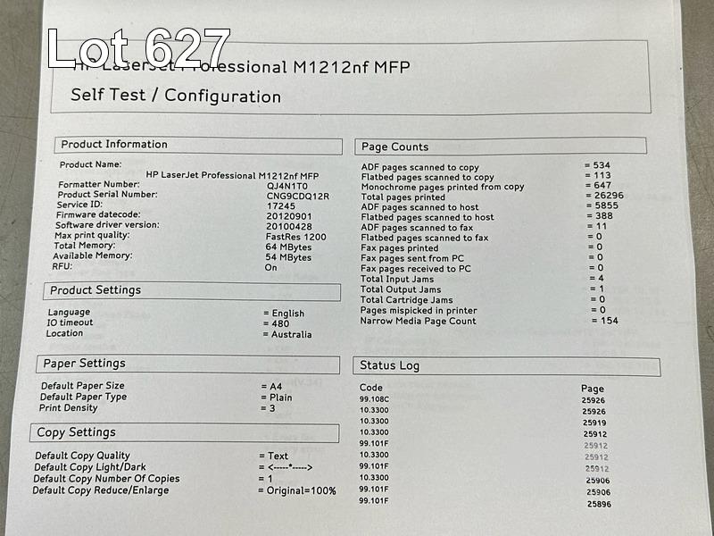 PRINTER, HP LASERJET M1212nf MFP, USB, NETWORK, 26,296 PAGES (TEST PAGE ATTACHED) S/N:CNG9CDQ12R