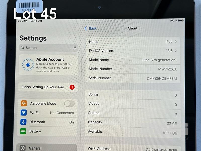 APPLE iPAD 7TH GEN, 32GB, Wi-Fi, SPACE GREY, MODEL MW742X/A, A2197 WITH COVER (NO CABLE, NO CHARGER) S/N:DMPZ5HDEMF3M