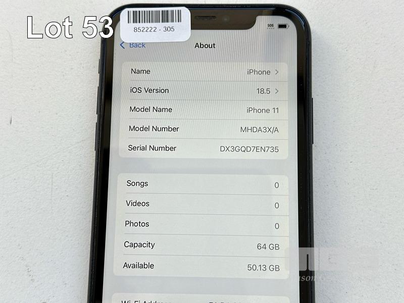 APPLE iPHONE 11, 64GB, MODEL MHDA3X/A, A2221, BLACK, BATTERY HEALTH 85% (NO CABLE, NO CHARGER) S/N:DX3GQD7EN735