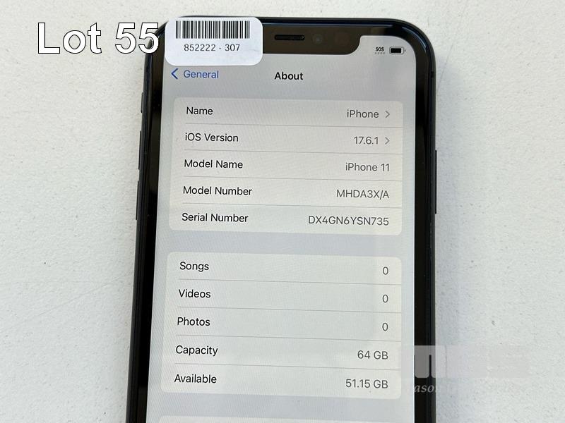 APPLE iPHONE 11, 64GB, MODEL MHDA3X/A, A2221, BLACK, BATTERY HEALTH 85% (NO CABLE, NO CHARGER) S/N:DX4GN6YSN735