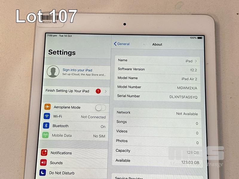APPLE iPAD AIR 2, 128GB, Wi-Fi, CELLULAR, SILVER, MODEL MGWM2X/A, A1567 (NO CABLE, NO CHARGER) (NOTE: MINOR SCRATCHES ON SCREEN) S/N:DLXNT5FAG5YQ