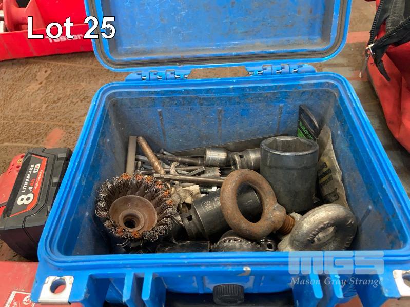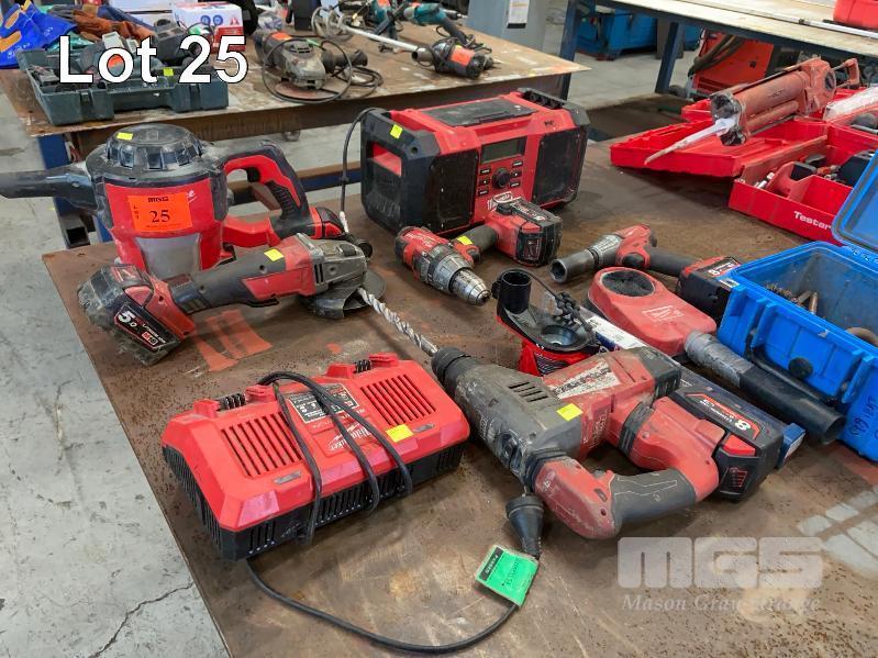 MILWAUKEE CORDLESS KIT INCLUDING VACUUM CLEANER, DRILL, IMPACT WRENCH, ANGLE GRINDER, IMPACT DRILL, CHARGER & 5 x BATTERIES
