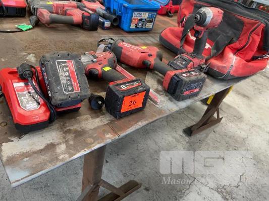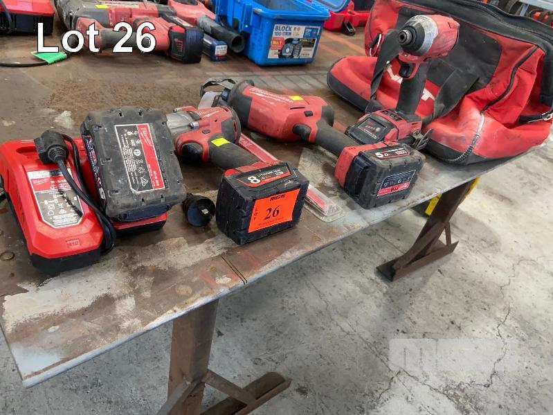 MILWAUKEE CORDLESS KIT INCLUDING IMPACT WRENCH, RECIPRO SAW & BLADES, TEK GUN, 4 x BATTERIES & CHARGERS WITH SOFT BAG