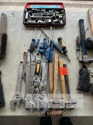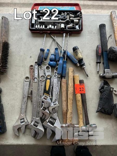 11 x ADJUSTABLE SPANNERS, SOCKET SET, HAMMERS, SCREWDRIVERS, ETC