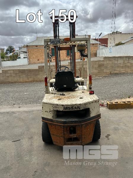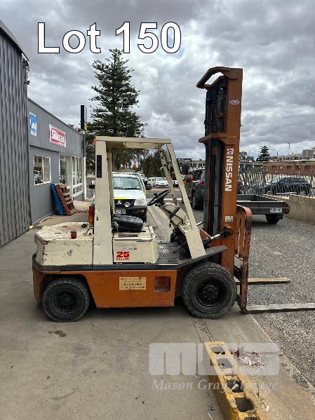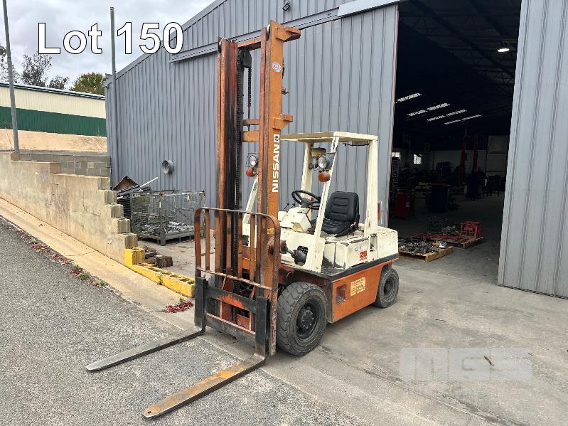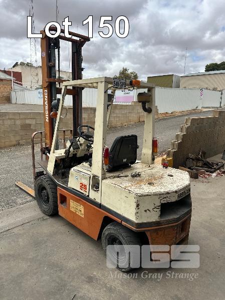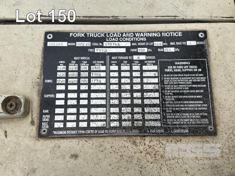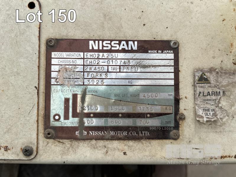NISSAN EH02 25 DIESEL FORK LIFT MOD: EG02A25U S/NO: 010745 HOURS: 3958 SHOWING CAPACITY: 2100kg SEE THROUGH 2 STAGE MAST, CLOSED HIGHT: 2820mm MAX LIFT HEIGHT: 4500mm, PNEUMATIC TYRES