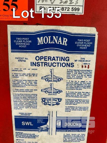 CLEAR FLOOR 2 POST HOIST, MOLNAR MOD: MF1705-93-OH-3T S/NO: 5668 3000kg CAPACITY 415V