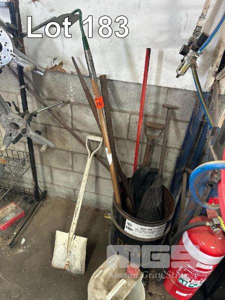 ASSORTED TOOLS, SHOVELS, PRY BAR, ETC