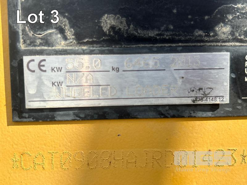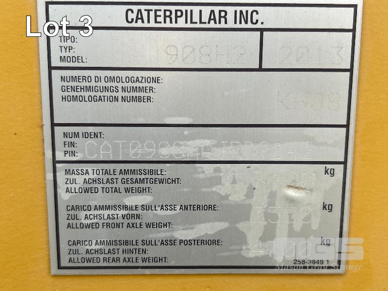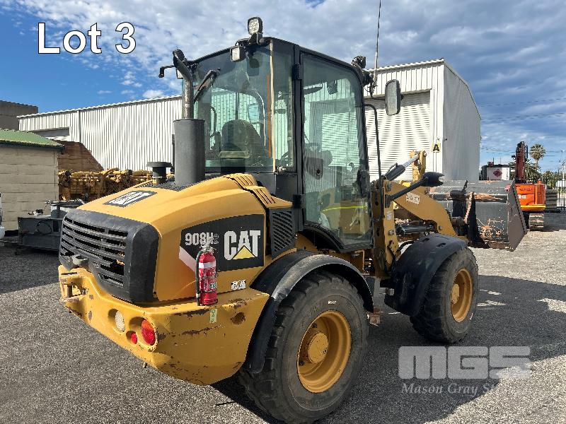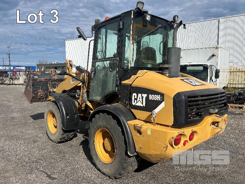 CATERPILLAR 908H2 WHEELED LOADER PIN: CAT0908HAJRD01423 HOURS: 9,358 SHOWING 4 CYLINDER TURBO DIESEL @55kw, ENGINE TYPE: C3.3B FITTED WITH GP BUCKET KEY #15 (WITH 1 KEY/S)