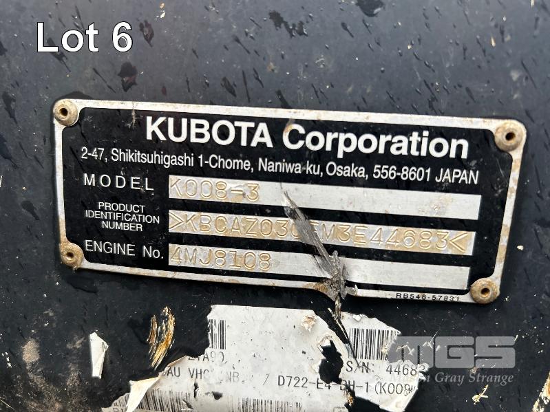 KUBOTA MINI EXCAVATOR MOD: K008-3 PIN: KBCAZ030TM3E44683 ENG: 4MJ8108 RUBBER TRACKED 3 CYLINDER DIESEL HOURS: 1,611 SHOWING PLEASE NOTE TRACK WIDTH ADJUSTMENT IS SEIZED AND NOT WORKING. KEY #25