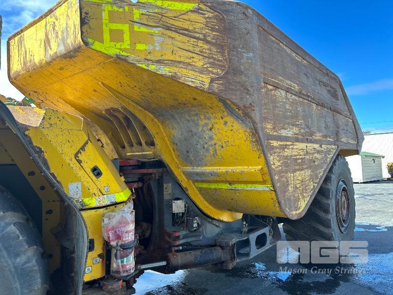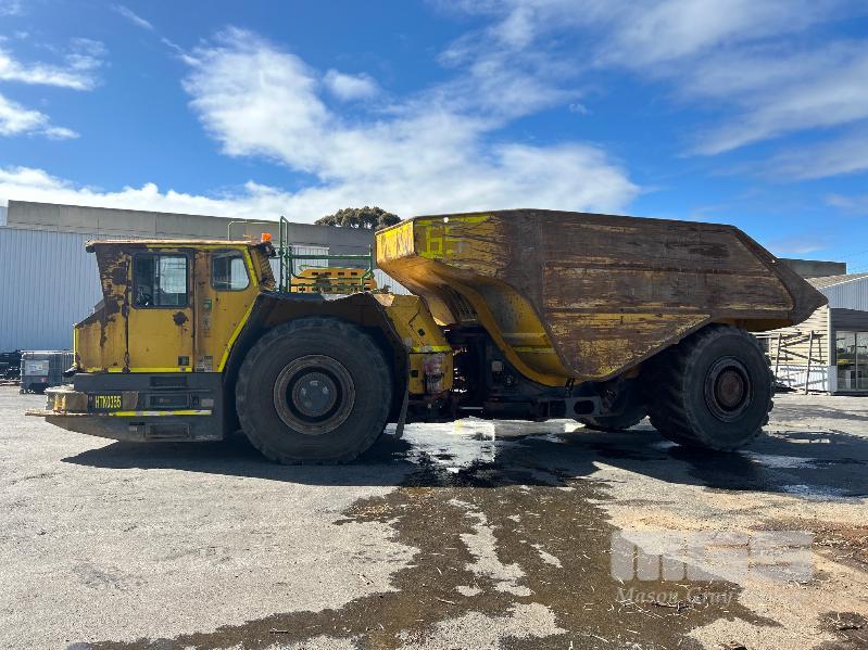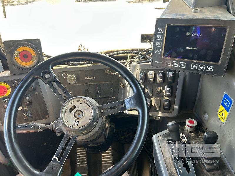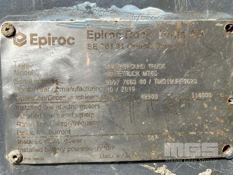 ATLAS COPCO MT65 MINE TRUCK, ARTICULATED UNDERGROUND TIPPER S/N: 8997766300/TMG19URE0623 PLANT NO: HTK0355 65 TONNE HAULAGE CAPACITY CUMMINS 567kw TURBO DIESEL ENGINE HOURS: 28,150 SHOWING 6 SPEED AUTOMATIC TRANSMISSION SAFE-T-CAB ROPS & FOPS PROTECTION FITTED WITH MINE SPEC FIRE SUPPRESSION SYSTEM EPIROC MANAGEMENT SYSTEM REVERSE CAMERA BATTERY ISOLATION SWITCHES NOTE: HAS FAULTY CRANK SPEED SENSOR TOTAL WEIGHT: 48,500kg APPROX