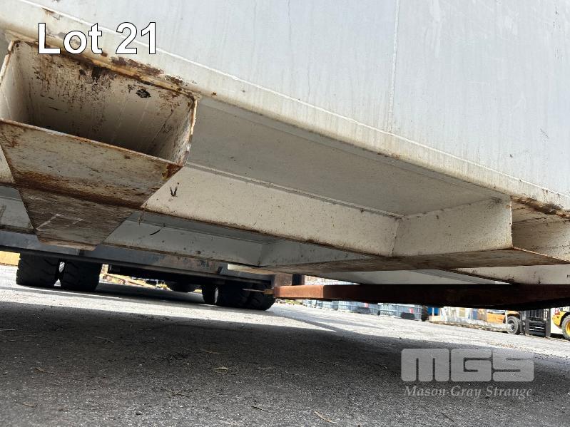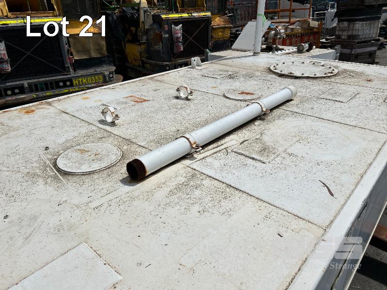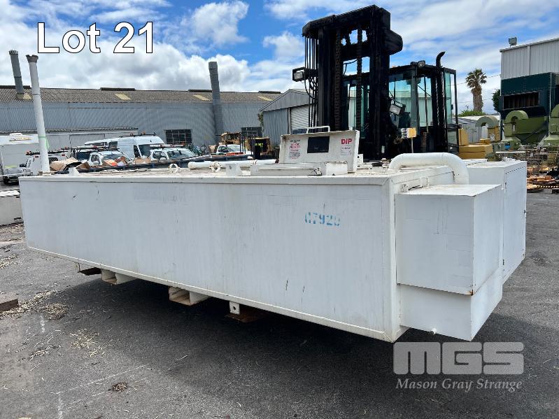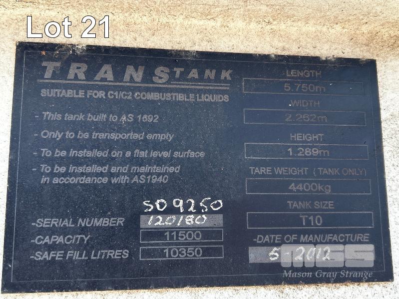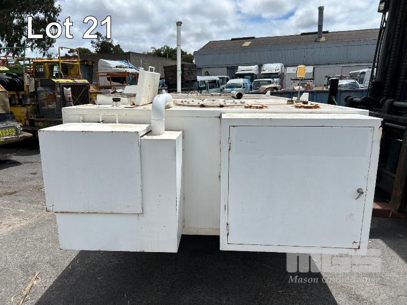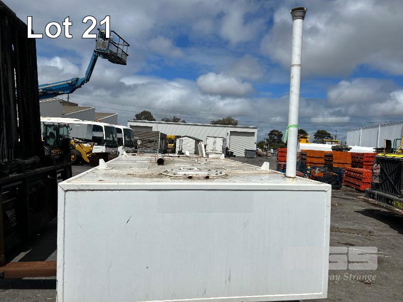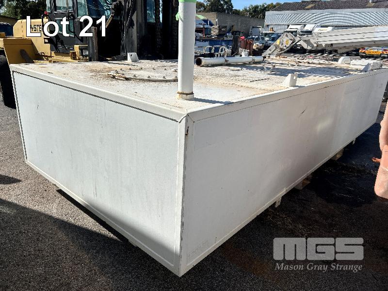 FUEL STORAGE TANK, TRANS TANK DOM: 2012 CAPACITY: 11,500 LITRE RECTANGLE STEEL CONSTRUCTION L: 5750mm, W: 2262mm, H: 1289mm WEIGHT: 4400kg EMPTY FITTED WITH FORK POCKETS & CORNER LIFTING LUGS