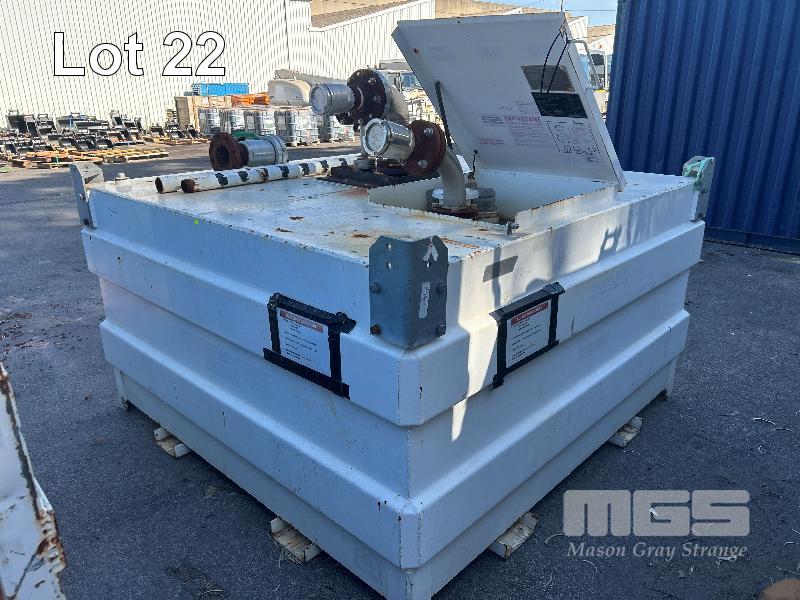 FUEL STORAGE TANK, TRANS TANK DOM: 2012 CAPACITY: 4470 LITRE SQUARE STEEL CONSTRUCTION L: 2306mm, W: 2306mm, H: 1330mm WEIGHT: 1560kg EMPTY FITTED WITH FORK POCKETS & CORNER LIFTING LUGS