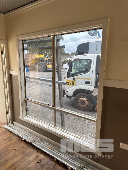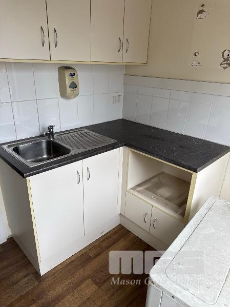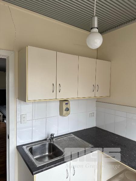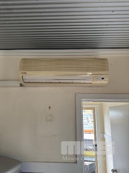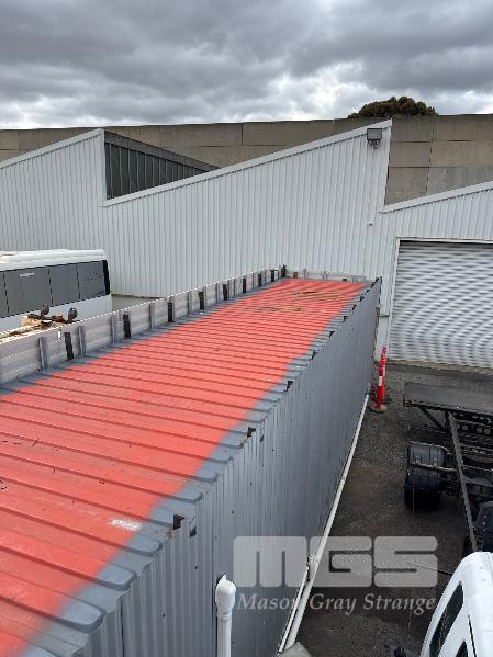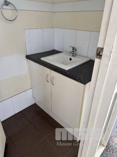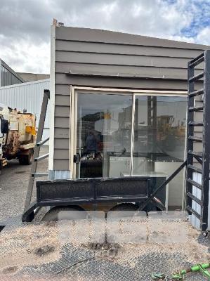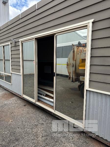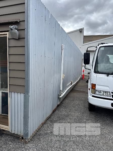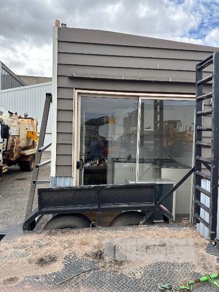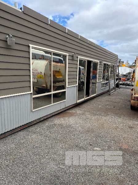 TRANSPORTABLE ACCOMODATION BUILDING, EXTERNAL: 12m x 2.6m MAIN LIVING AREA: 8700 x 2300 x 2600mm (H), KITCHEN: 2100 x 2300 x 2600mm (H), BATHROOM: 1000 x 2300 x 2600mm (H) 10 x 240V GPO'S, KITCHEN SINK & COUNTER, BATHROOM VANITY & TOILET, WITH LEAN TO ROOF, NOT ASSEMBLED & AC UNIT NOT INSTALLED 40ft SHIPPING CONTAINER BASE NOTE: HAS SOME LEAKS