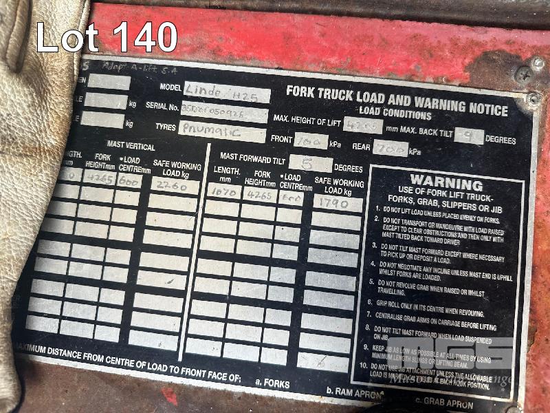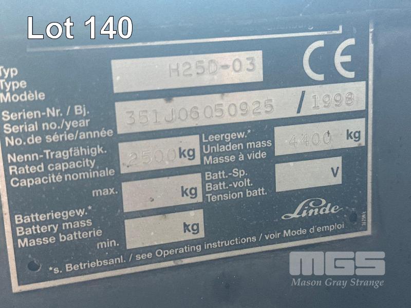 LINDE FORKLIFT MOD: H25D-03 SERIAL: 351J06050925 DOM: 1996 HOURS: 10,951 SHOWING 2,500kg LIFT, 4265mm MAST DIESEL REGISTERED