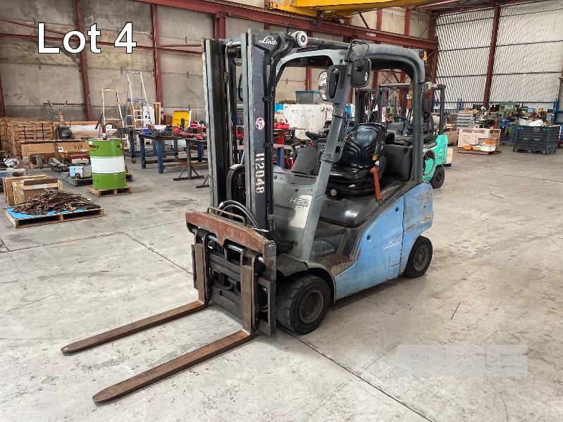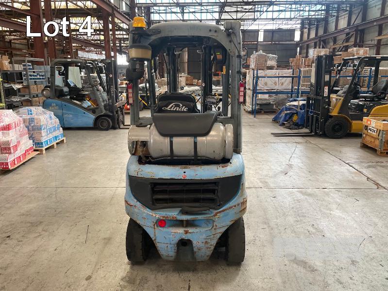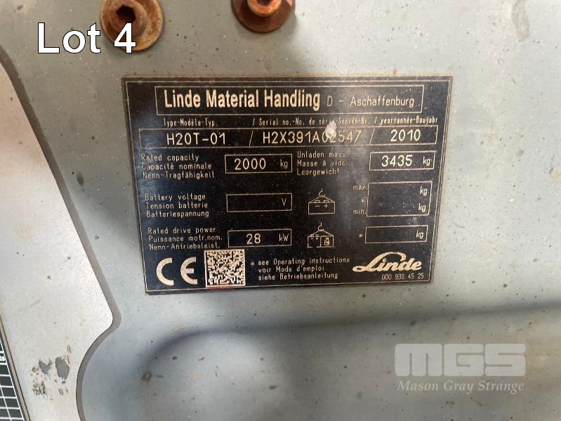2010 LINDE FORKLIFT, TYPE: H20T-01, SERIAL: H2X391A02547, 2000kg CAP, MAX LIFT: 4625mm CONTAINER MAST, SIDESHIFT, TILT, BLADE POSITION, SOLID TYRES, 3 STAGE MAST DIGITAL CODE START: 67342#, HRS: 7949, LPG DOES NOT INCLUDE LPG BOTTLE