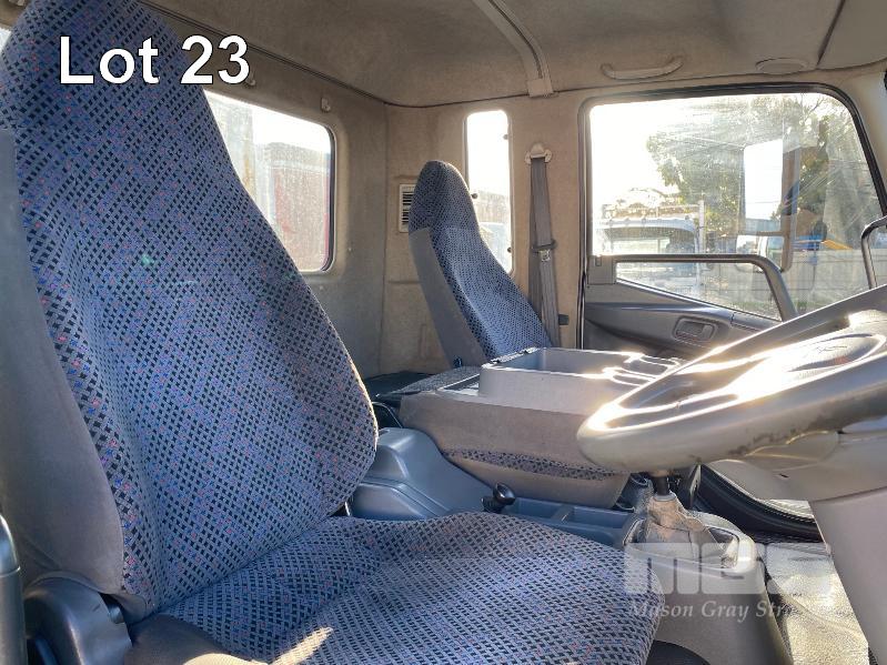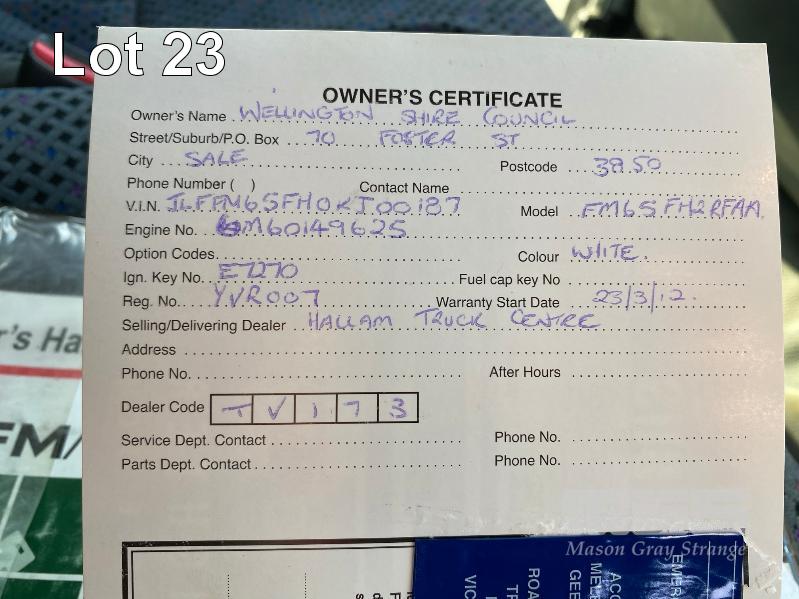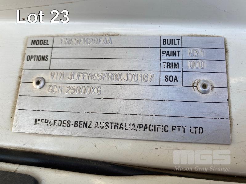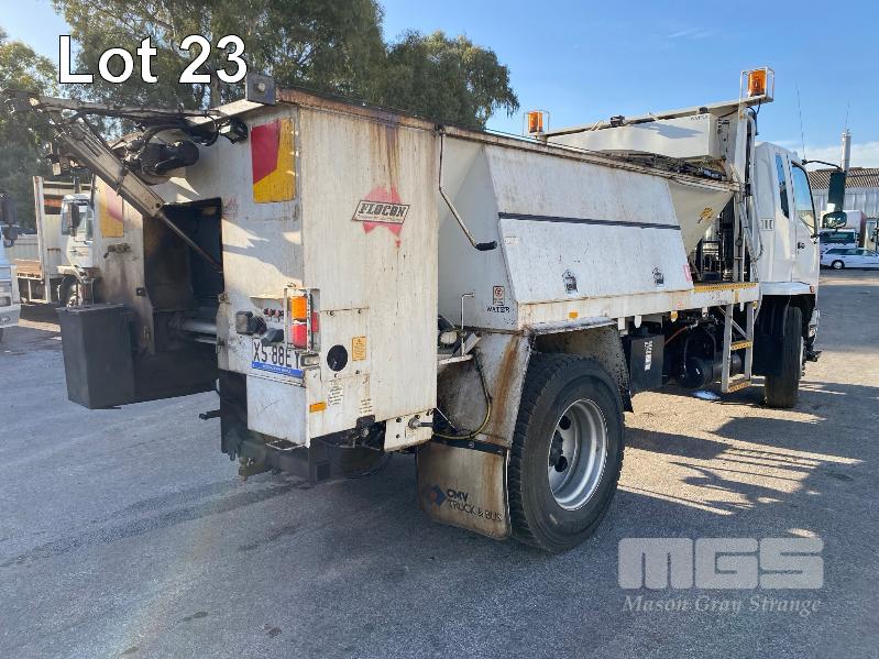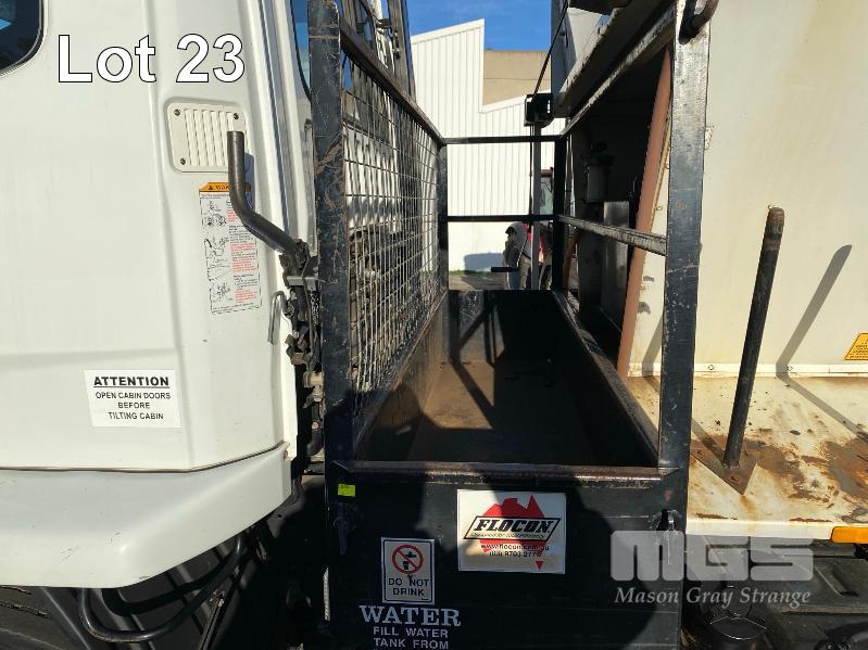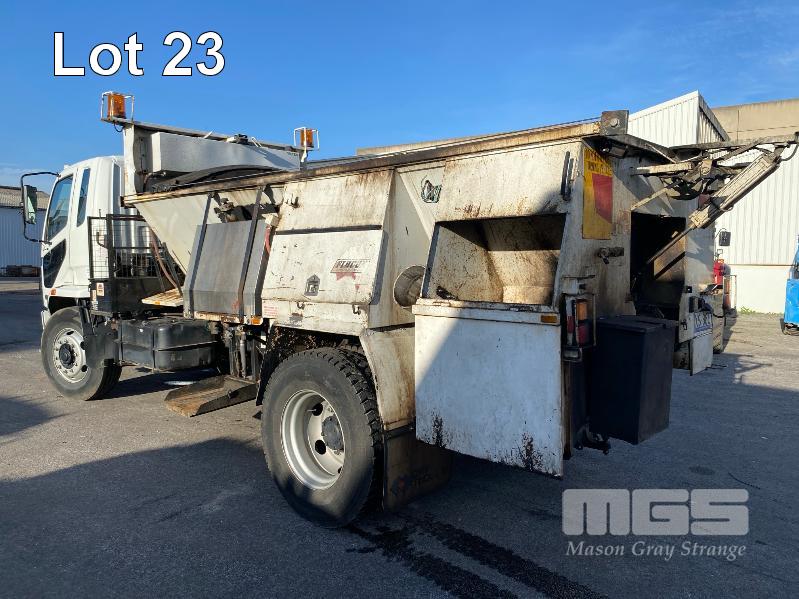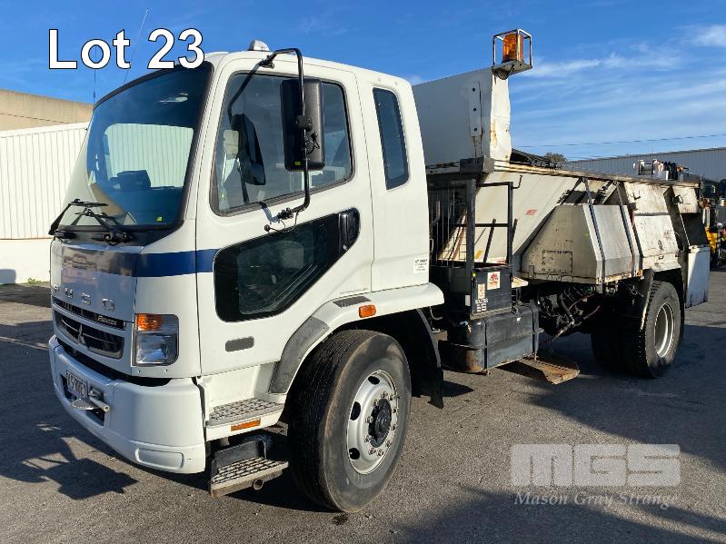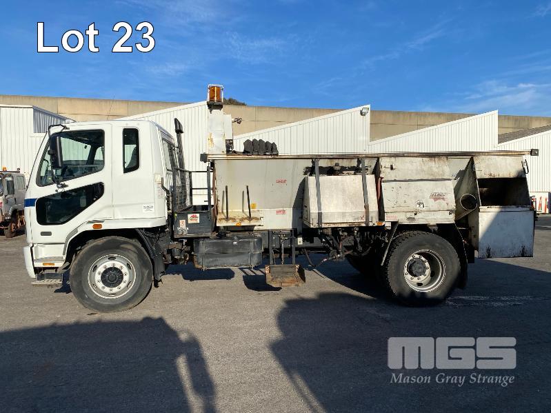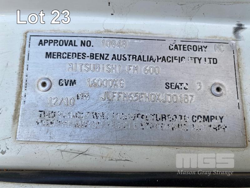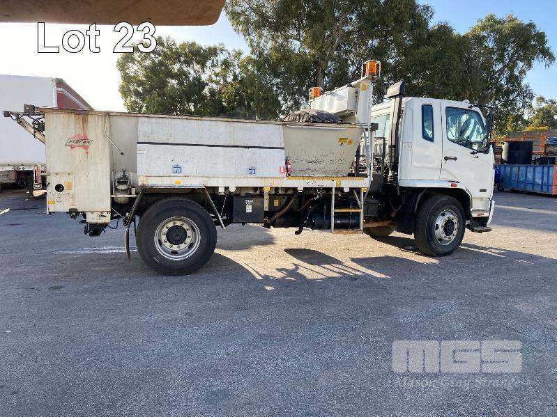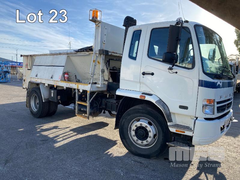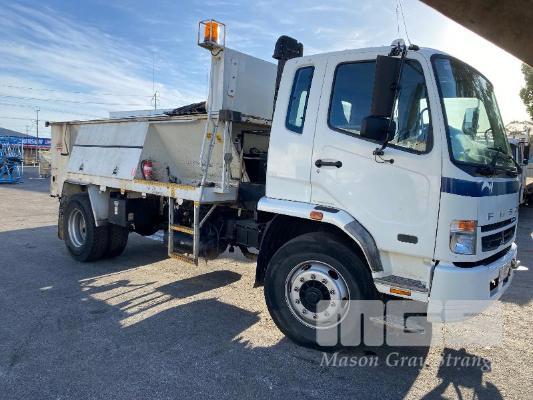 2010 MITSUBISHI FUSO, FIGHTER 10, FM600, FM65FH2RFAA, 4x2, BITUMEN CONVEYOR TRUCK REG: XS 88 EY VIN: JLFFM65FH0KJ00187 ENG: 6M60149625 ODO: 282,897kms SHOWING GVM: 16,000kg GCM: 25,000kg 6 SPEED MANUAL TRANSMISSION, SPRING SUSPENSION, WHITE DUCO, 2 DOORS, 2 SEAT, AIR CON, CB RADIO, FLOCON BITUMEN STEEL CONVEYOR SYSTEM REAR DISCHARGE, FORWARD & REVERS CONVEYOR RETRACTABLE OVER HEAD COVER PTO, HYDRAULIC LIFT PLATFORM, MULTIPLE TOOL COMPARTMENTS, WATER & CLEANING TANKS, HOSE REEL REVERSE CAMERA & 2 WAY RADIO KEY #46 (WITH PAPERS, WITH 1 KEY/S, WITH OWNER'S MANUAL, WITH SERVICE BOOKS)