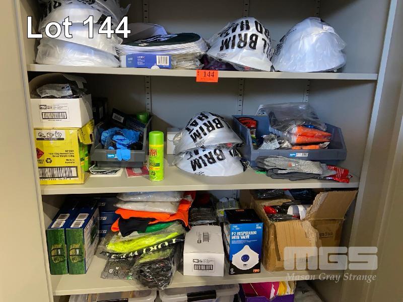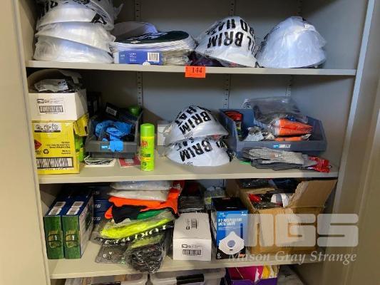 NEW HARD HATS, SUN HATS, PPE,GLOVES, GLASSES, RESPIRATORS, TRAVEL BAGS, NEW CONTENTS CABINET