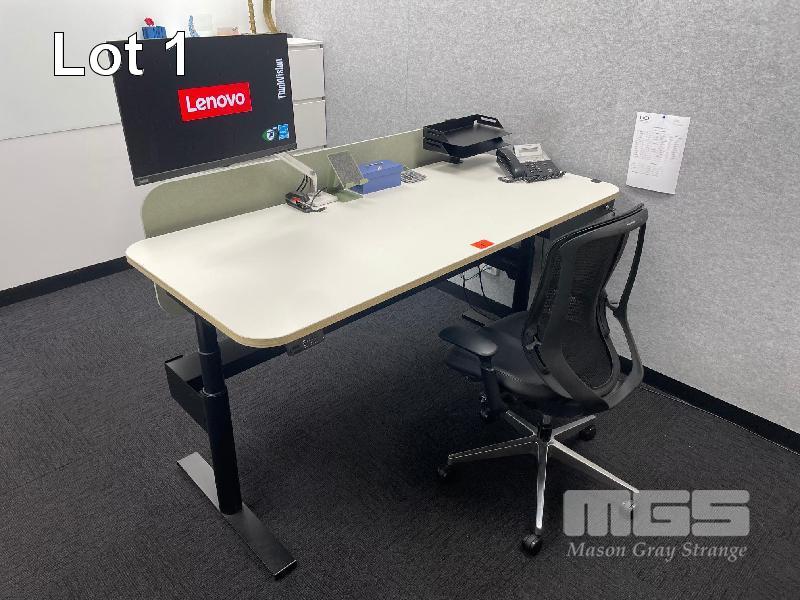 ELECTRIC RISE & FALL DESK, WHITE TIMBER LAMINATE 1800 x 800mm, 240V MAX: 1280mm(H) BLACK STEEL FRAME, LOCKABLE DRAWER, OKAMURA GAS LIFT CHAIR & LENOVO 27" MONITOR