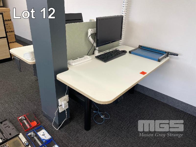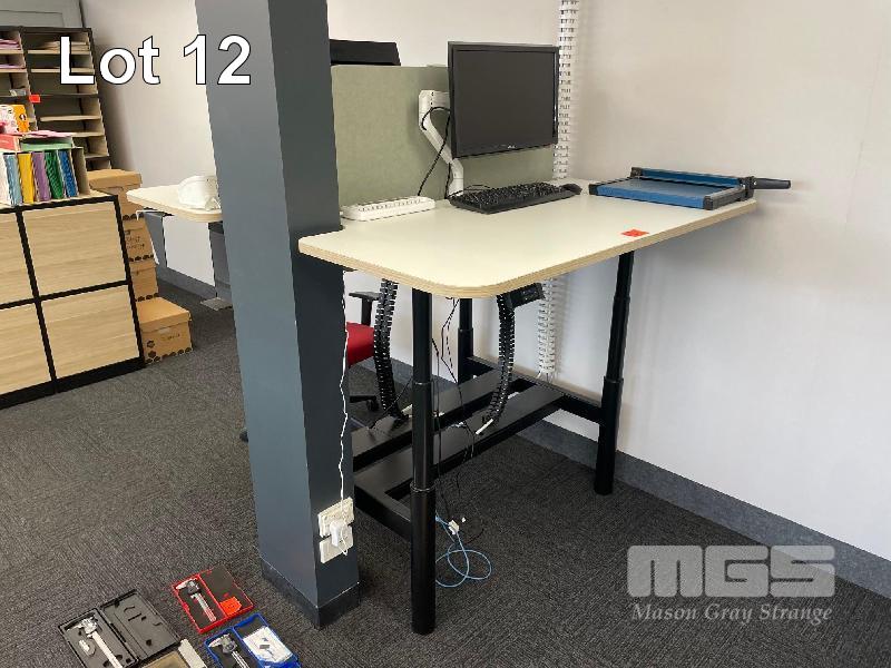 ELECTRIC RISE & FALL DESK, DOUBLE SIDED, WHITE TIMBER LAMINATE 1400 x 750mm, 240V BLACK STEEL FRAME MAX: 1280mm (H) ASUS 22" MONITOR, PHILLIPS 24" MONITOR & BLIZZARD A3 LAMINATOR 1 x GAS LIFT CHAIR