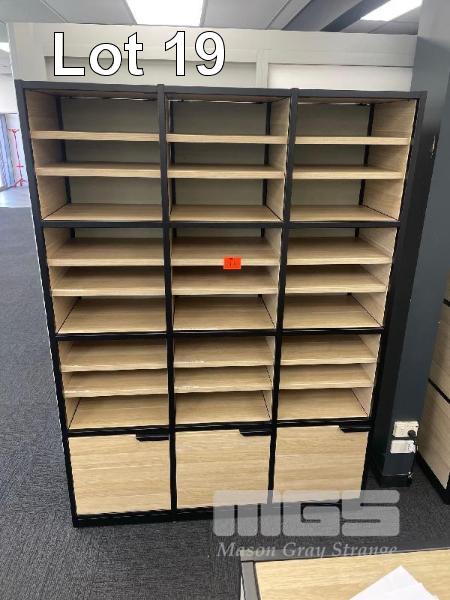 BLACK STEEL FRAME FILE STORAGE SHELVING UNIT, 1450 x 430 x 2000mm (H), 3 BAY, 3 DOOR, 9 TIER WOOD GRAIN TIMBER LAMINATE