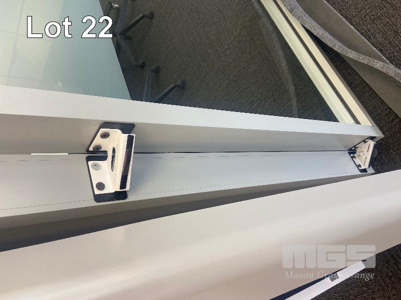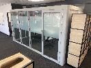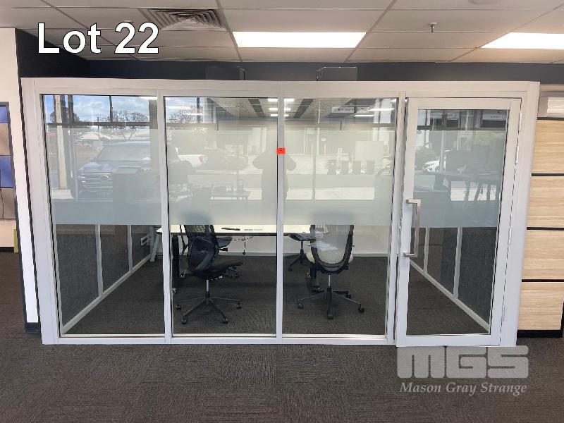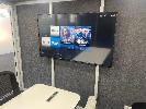 OFFICE POD, FREESTANDING, ALLOY FRAME, SINGLE DOOR, 3 x WINDOWS, 4200 x 3100 x 2230mm LED LIGHTING, 240V AIR RETICULATION, ELECTRIC RISE & FALL MEETING TABLE, 2000 x 800mm WITH 2 x TiMOTION TBB9 BATTERIES WHITE TIMBER LAMINATE, 4 x GAS LIFT CHAIRS, FFALCON 65" SMART TV WITH REMOTE (BUYER TO DISMANTLE)