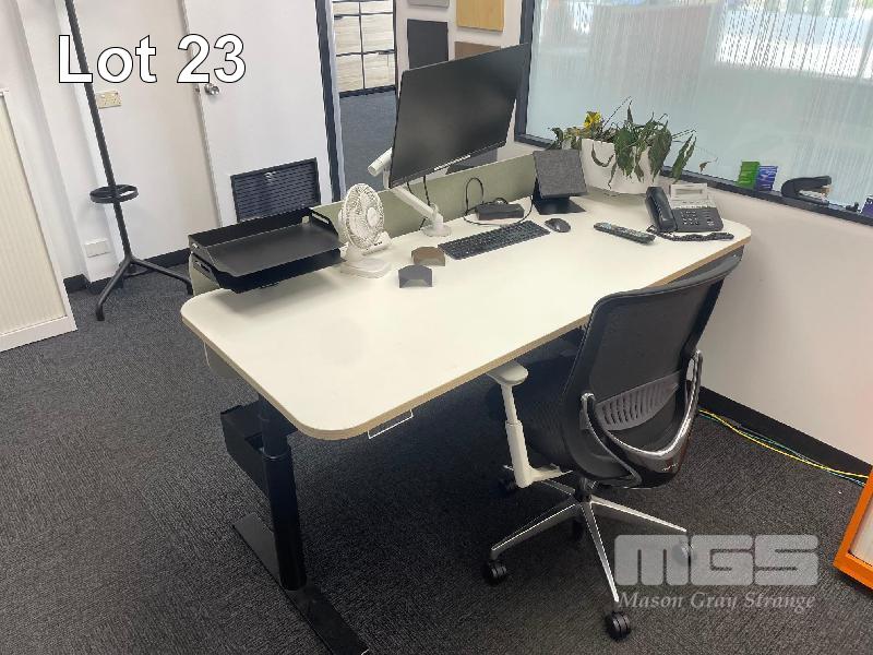 CONTENTS OF OFFICE INCLUDING ELECTRIC RISE & FALL DESK, WHITE TIMBER LAMINATE 1800 x 800mm, 240V BLACK STEEL FRAME GAS LIFT CHAIR, LENOVO 27" MONITOR, 2 x WHITE TAMBOUR CABINETS, 900 x 480 x 1200mm (H) & 1200 x 480 x 1200mm (H), ORANGE TAMBOUR CABINET WITH 3 x DRAWER, 900 x 500 x 600mm, KOGAN 42" TV WITH REMOTE & COAT RACK