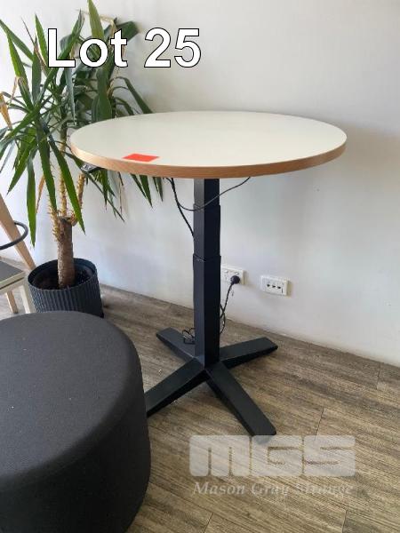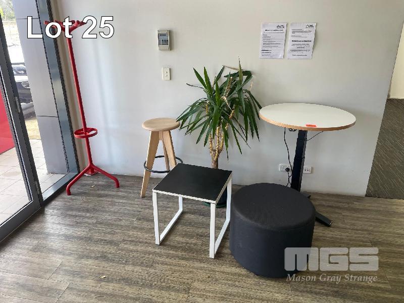 RED COAT RACK, 1600mM (H), TIMBER STOOL, SIDE TABLE, STEEL FRAME, 500 x 500mm, BLACK CLOTH OTTOMAN, 600mm (D) & ELECTRIC RISE & FALL MEETING TABLE, 750mm (D)