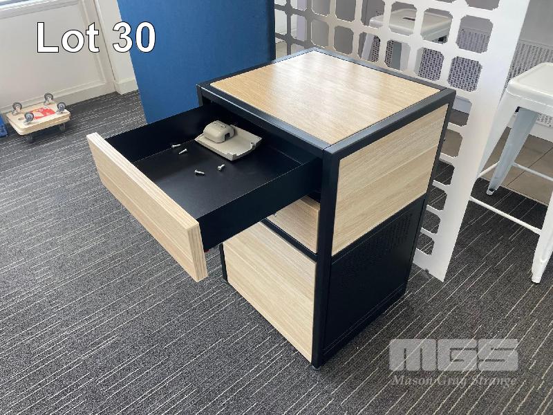 FFALCON 40" SMART TV MOUNTED ON OFFICE PARTITION WITH BLACK STEEL AV CABINET, WOOD GRAIN TIMBER LAMINATE 500 x 450 x 780mm