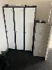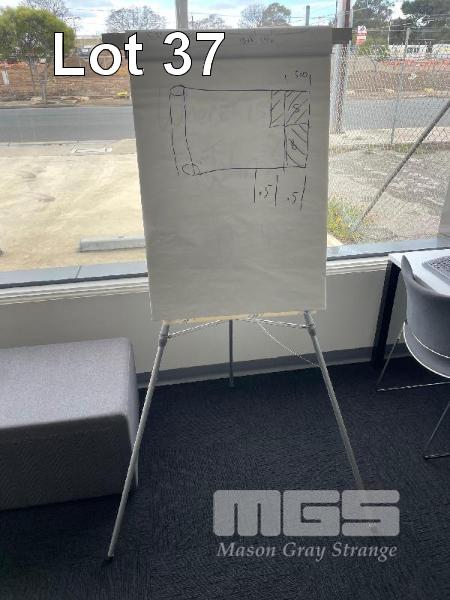 DESK, WHITE LAMINATE 1300 x 600mm, BLACK STEEL FRAME VISITORS CHAIR, BENQ 22" MONITOR 2 DOOR GREEN STEEL STORAGE UNIT, 1200 x 500 x 450mm COLLAPSIBLE ALLOY EASEL, 4 DRAWER FILING CABINET & 3 DOOR STEEL LOCKER SET WITH KEYS, 1800mm