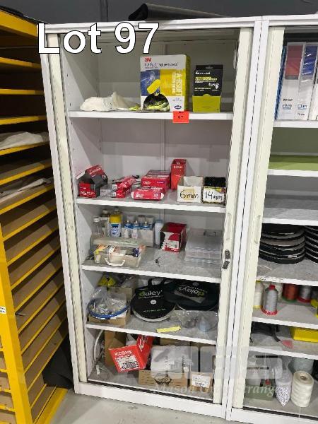 TAMBOUR STOCK CUPBOARD, 2000 (H) x 850 (W) x 450mm (D) & CONTENTS STAPLES, GLUES, FITTINGS, EAR PLUGS, WIPES,