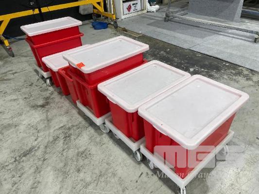 8 x PVC STORAGE TUBS, 5 x LIDS & 4 x CASTOR BASES