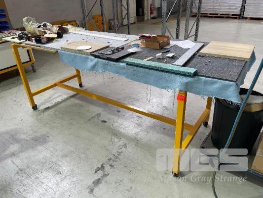 FITTERS MOBILE REPAIR TABLE, 300 x 1000mm LOCKING CASTORS, SMALL STOCK TROLLEY & RISE & FALL ELECTRIC WORK TABLE, LAMINATED TOP, 1200 x 1200mm