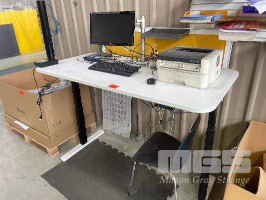 WHITE RISE/FALL TABLE, 1600 x 800mm, KEYBOARD, MONITOR, FUJI PRINTER, CHAIR & PINBOARD