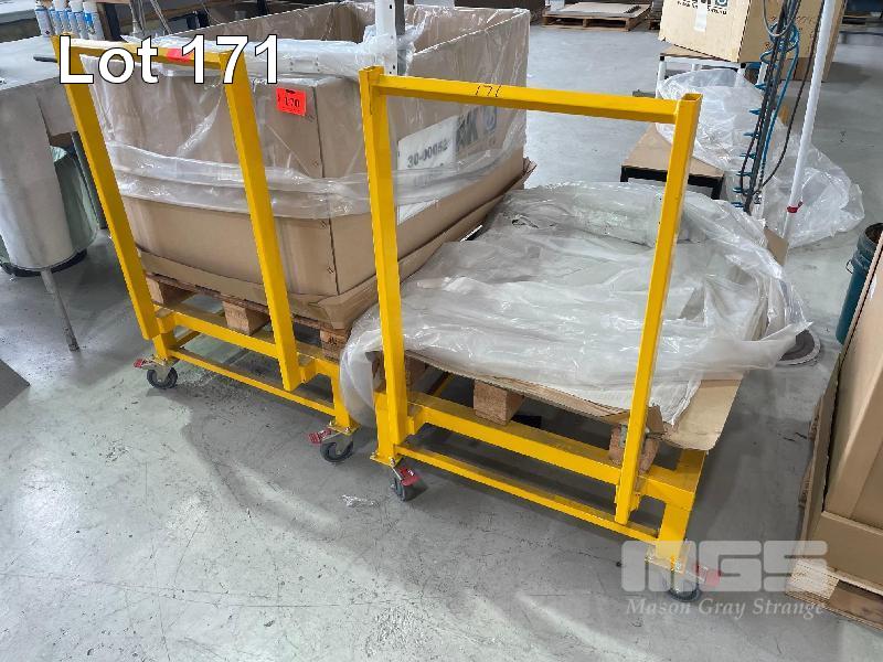 2 x PALLET TROLLEYS, YELLOW, LOCKING CASTORS