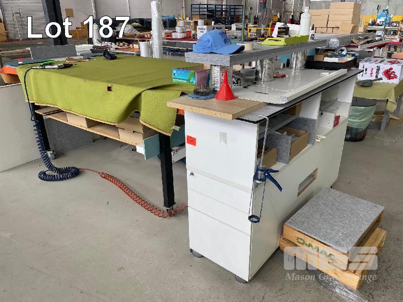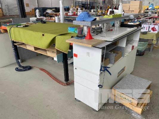 RISE/FALL ELECTRIC ASSEMBLY BENCH, 2400 x 1200mm, PADDED TOP, TEK GUN, AIR COIL, PLASTIC WRAP STAND & MOBILE PARTS CUPBOARD