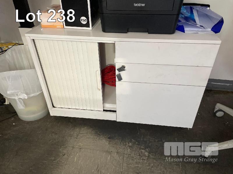 DOUBLE SIDES ELECTRIC RISE & FALL DESK 1500 x 640mm EACH SIDE 2 x MONITORS 2 x KEYBOARDS 2 x GAS LIFT CHAIRS 4 DRAWER STEEL FILING CABINET LOW LINE 3 DRAWER, 1 DOOR, WHITE STEEL STORAGE UNIT