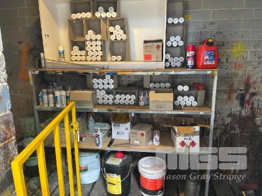 CONTENTS OF PAINTS STORAGE: SPRAY PAINTS ROLLERS VARIOUS SOLVENTS LARGE QUANTITY