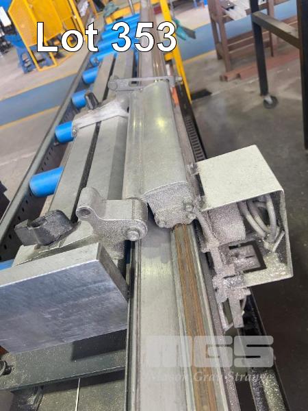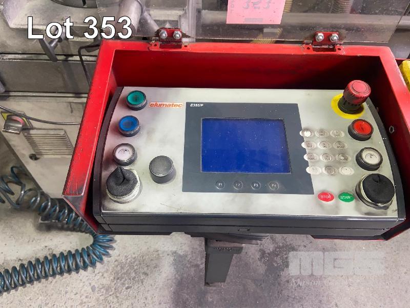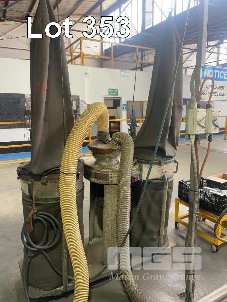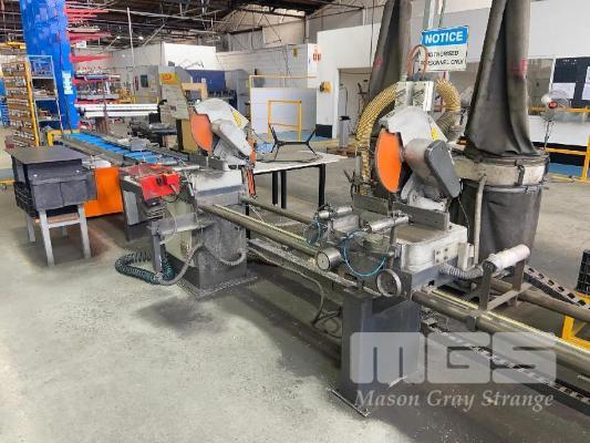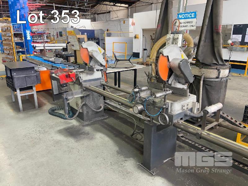 TWIN HEAD ELUMATEC SAW SET WITH E355/P CONTROL TWIN PNEUMATIC CLAMPS SWIVEL HEAD 1 x FIXED & 1 x SLIDING SMALL WORK STAND, ORANGE TOOL CUPBOARD & TWN BAG DUST EXTRACTOR