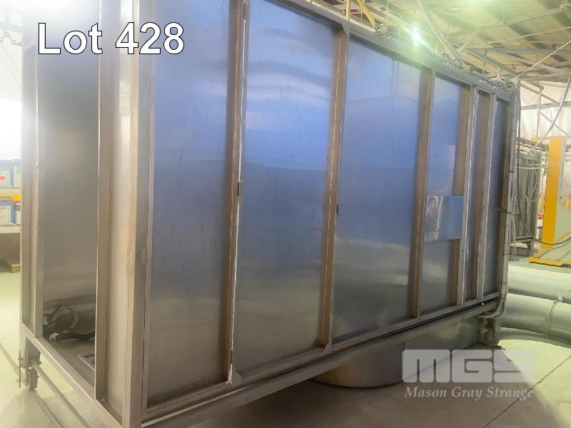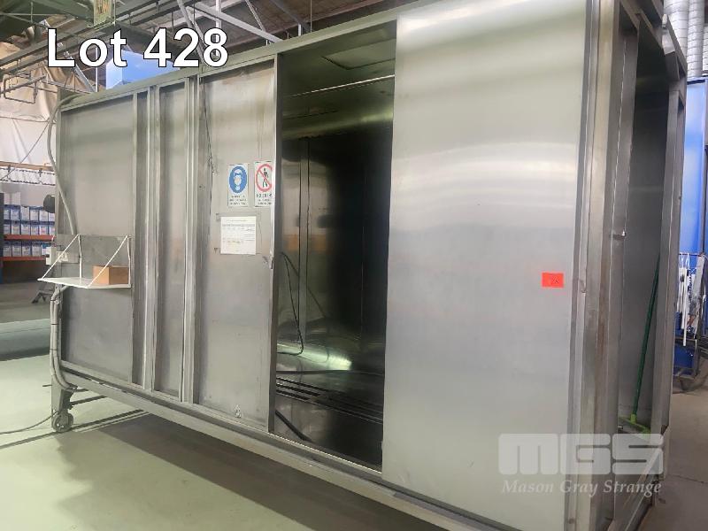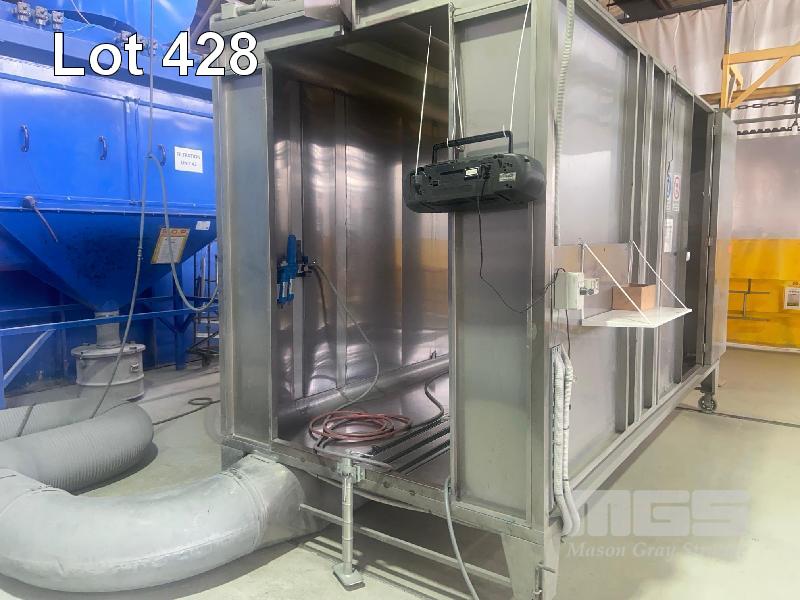 POWDER COAT BOOTH, 4000 (L) x 1900 (D) x 2700mm (H) STAINLESS STEEL TAPERED FLOOR TRAP LIGHTING, PASS THROUGH LINE ACCESS & EXIT, TUBE TO FIRST CONNECTION UNIT IS ON RAILS, 4300mm (L) HEAD MASK AIR LINES & REGULATOR SET CAN BE ADAPTED FOR AUTO SPRAY UNITS
