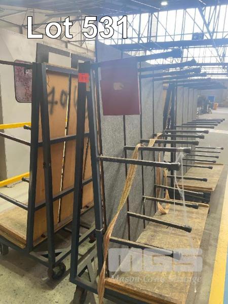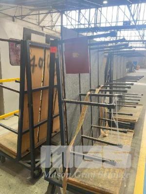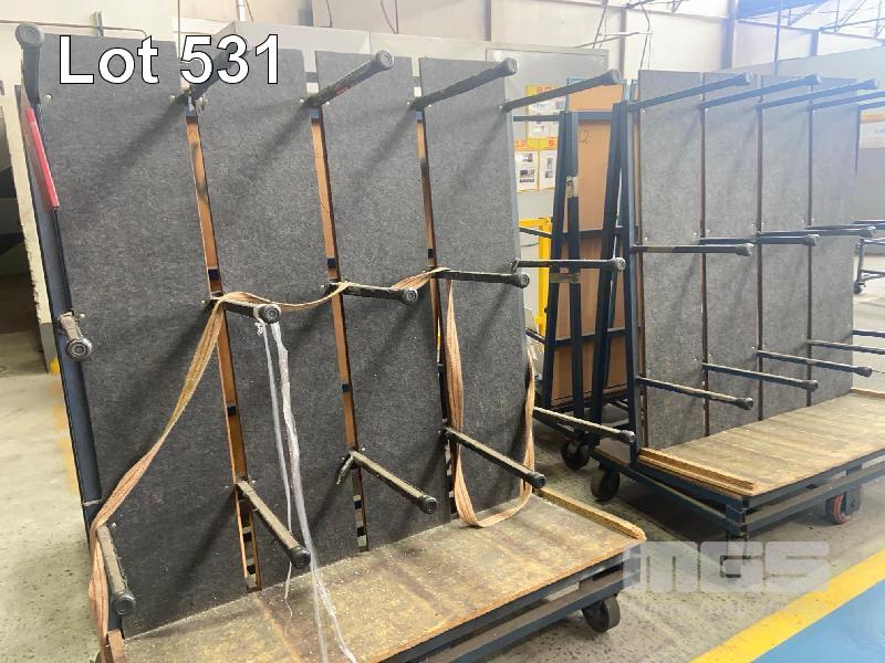 4 x ANGLE BACK PRODUCT TROLLEYS, 1400 x 1600mm APPROX, TUBE STEEL,TIMBER BASE, 6 x NYLON CASTORS