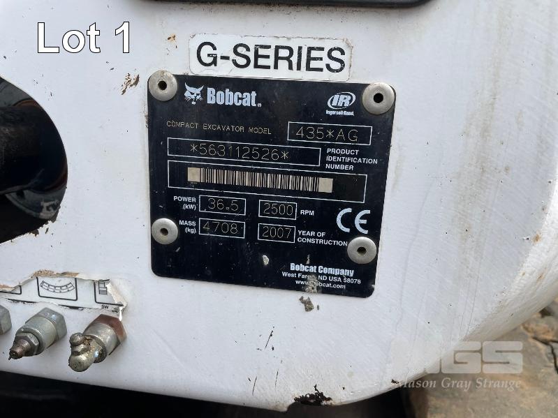 2007 BOBCAT MINI EXCAVATOR G SERIES, MOD: 435*AG, PIN: *56311256*, 36.5kw, MASS: 4708kg, REG: MVP885, ENCLOSED CAB 3' TRIM BUCKET & 450 & 550mm BUCKETS SAFETY INTERLOCKS CURRENTLY BYPASSED TO RUN FOR MAINTENANCE- NEEDS IMMEDIATE ATTENTION