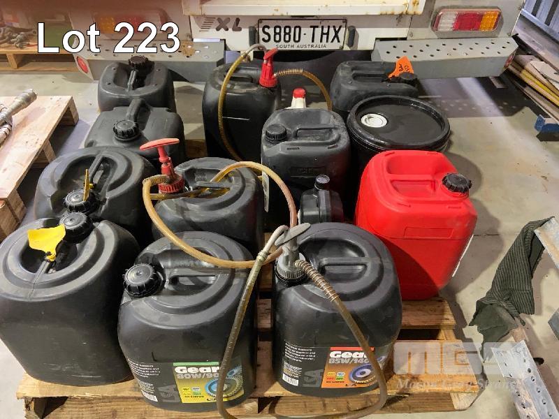 ASSORTED 20 LITRE OIL PUMP/CONTAINERS & ASSORTED AG OILS, ENGINE, FINAL DRIVE, ETC