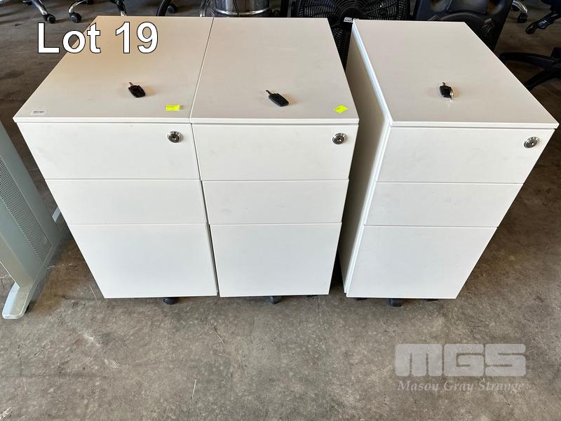 3 x UNDERDESK MOBILE PEDESTALS, 3 DRAWER, WHITE STEEL, LOCKABLE WITH KEYS