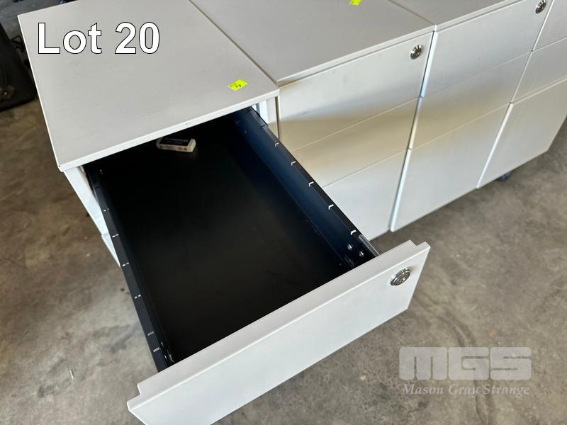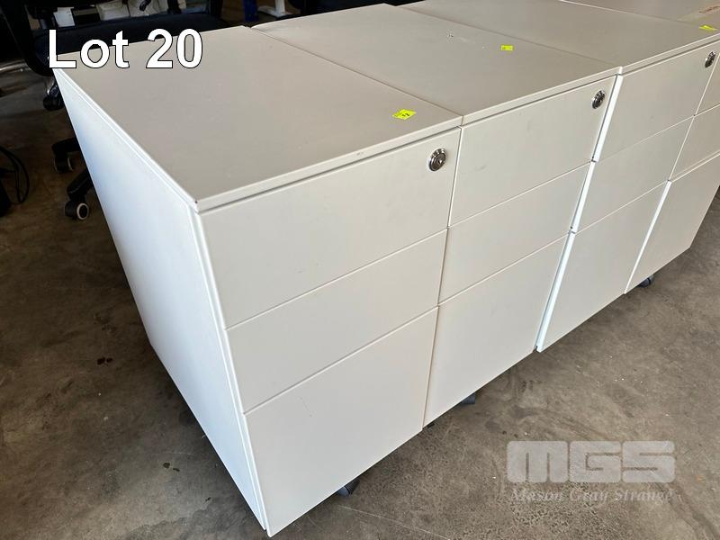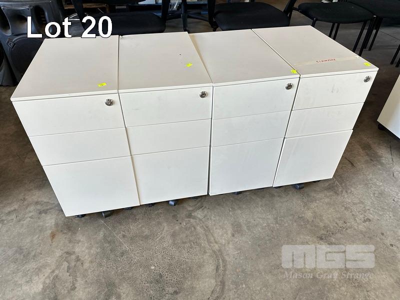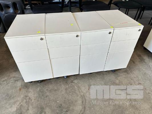 4 x UNDERDESK MOBILE PEDESTALS, 3 DRAWER, WHITE STEEL, LOCKABLE (NO KEYS)