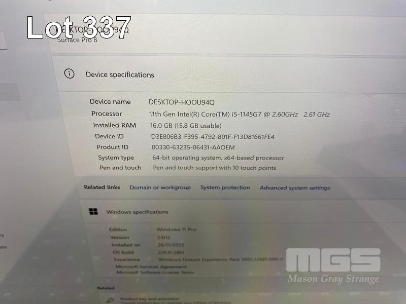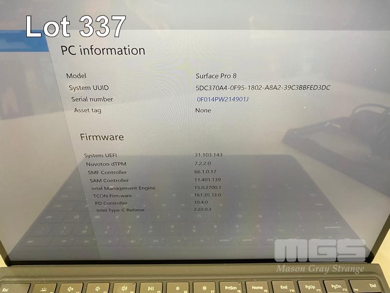 TABLET PC, MICROSOFT SURFACE PRO 8, MODEL 1982, CORE i5 1145G7 (11TH GEN) @ 2.6GHz, 16GB DDR4 RAM, 256GB NVMe M.2 SSD, 13" TOUCHSCREEN (2880x1920), INTEL IRIS Xe GRAPHICS, Wi-Fi, CELLULAR, BLUETOOTH, WINDOWS 11 PRO INSTALLED, KEYBOARD TYPE COVER, CASE & POWER SUPPLY S/N:0F014PW214901J