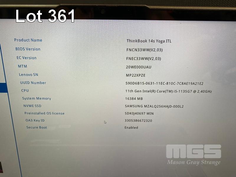 LAPTOP, LENOVO THINKBOOK 14s YOGA ITL, TYPE 20WE, CORE i5 1135G7 (11TH GEN) @ 2.4GHz, 16GB DDR4 RAM, 256GB NVMe M.2 SSD, 14" TOUCHSCREEN (1920x1080), INTEL IRIS Xe GRAPHICS, Wi-Fi, BLUETOOTH, WINDOWS 11 PRO INSTALLED & USB-C POWER SUPPLY S/N:MP22XPZE
