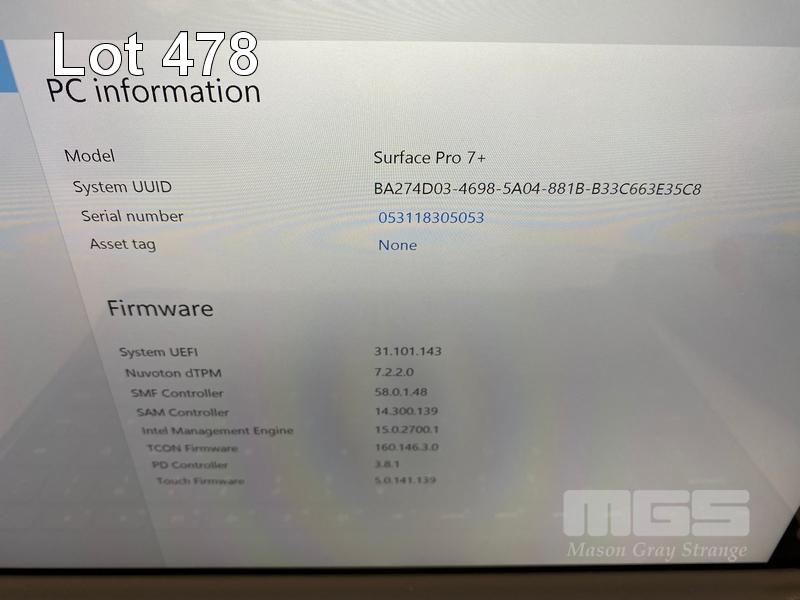TABLET PC, MICROSOFT SURFACE PRO 7+, MODEL 1961, CORE i5 1135G7 (11TH GEN) @ 2.4GHz, 16GB DDR4 RAM, 256GB NVMe M.2 SSD, 12.3" TOUCHSCREEN (2736x1824), INTEL IRIS Xe GRAPHICS, Wi-Fi, CELLULAR, BLUETOOTH, WINDOWS 11 PRO INSTALLED, KEYBOARD TYPE COVER, CASE & POWER SUPPLY S/N:053118305053